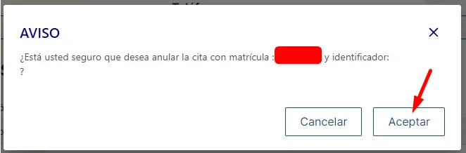 En la ventana emergente que se abre, debes de pulsar en «Aceptar» para proceder con la cancelación/anulación de la cita de SITVAL y ya estaría to.