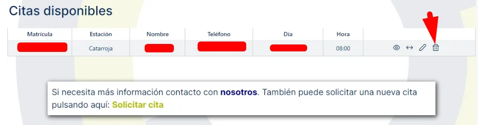 Localiza tu cita en el panel y haz clic en la papelera que verás al lado derecho para proceder con la anulación.