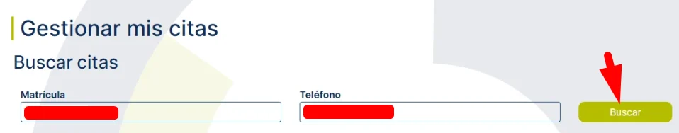 Debes de ingresar tanto la matrícula de tu vehículo como el teléfono que va asociado a la cita el día que la pediste, posteriormente haz clic en «Buscar».