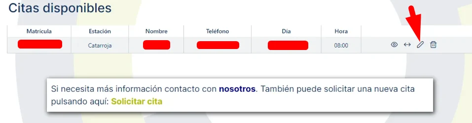 Busca tu cita en el listado de citas disponibles y haz clic en el símbolo del lápiz que aparece a la derecha de la cita.