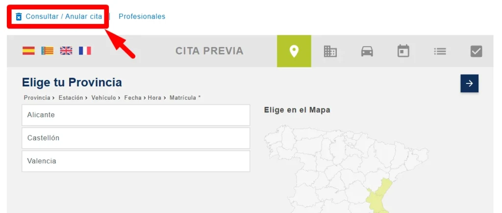 Haz clic en el enlace que dice «Consultar / Anular cita» en color azul en la parte superior izquierda.