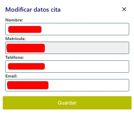 Modifica los datos que sean necesarios, tanto los personales como la fecha y hora de la cita y una vez lo tengas todo, haz clic en el botón verde «Guardar».