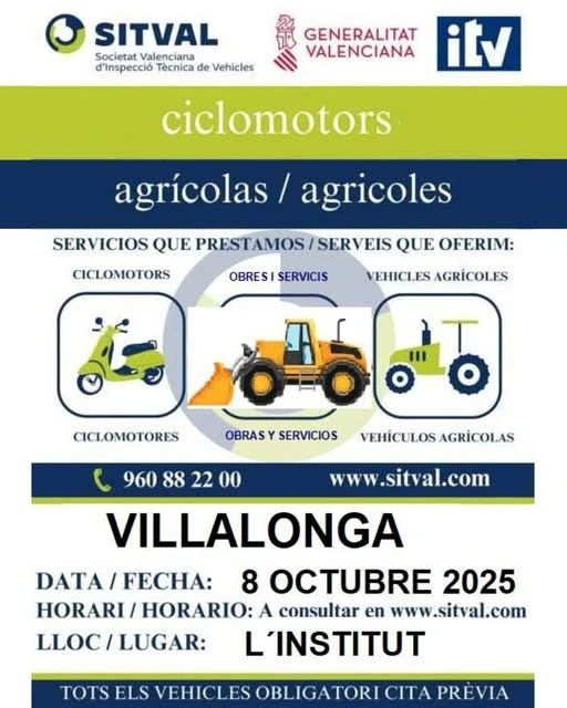 La Inspección Técnica de Vehículos se desplazará a Villalonga el miércoles 8 de octubre, víspera del Día de la Comunitat Valenciana, para pasar revista a ciclomotores, maquinaria de obras y servicios y vehículos agrícolas. La jornada será atendida por la Societat Valenciana d’Inspecció Tècnica de Vehicles (SVITSA) en coordinación con el Ayuntamiento de Villalonga.